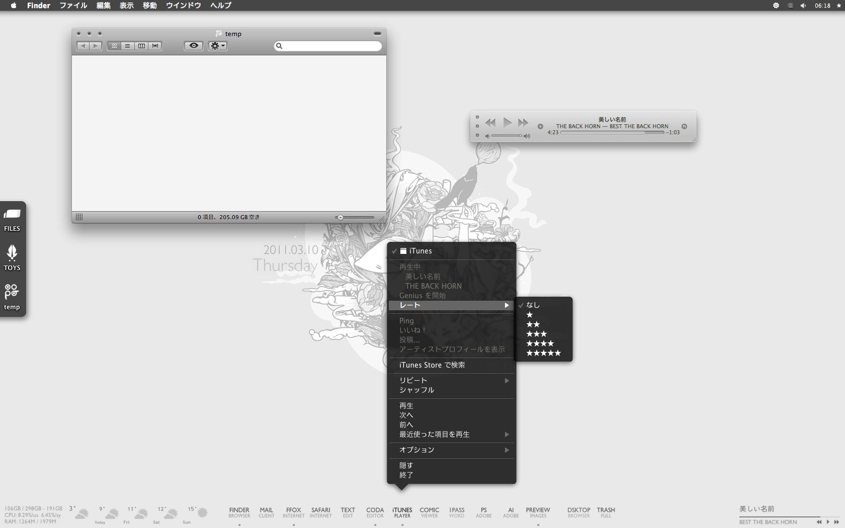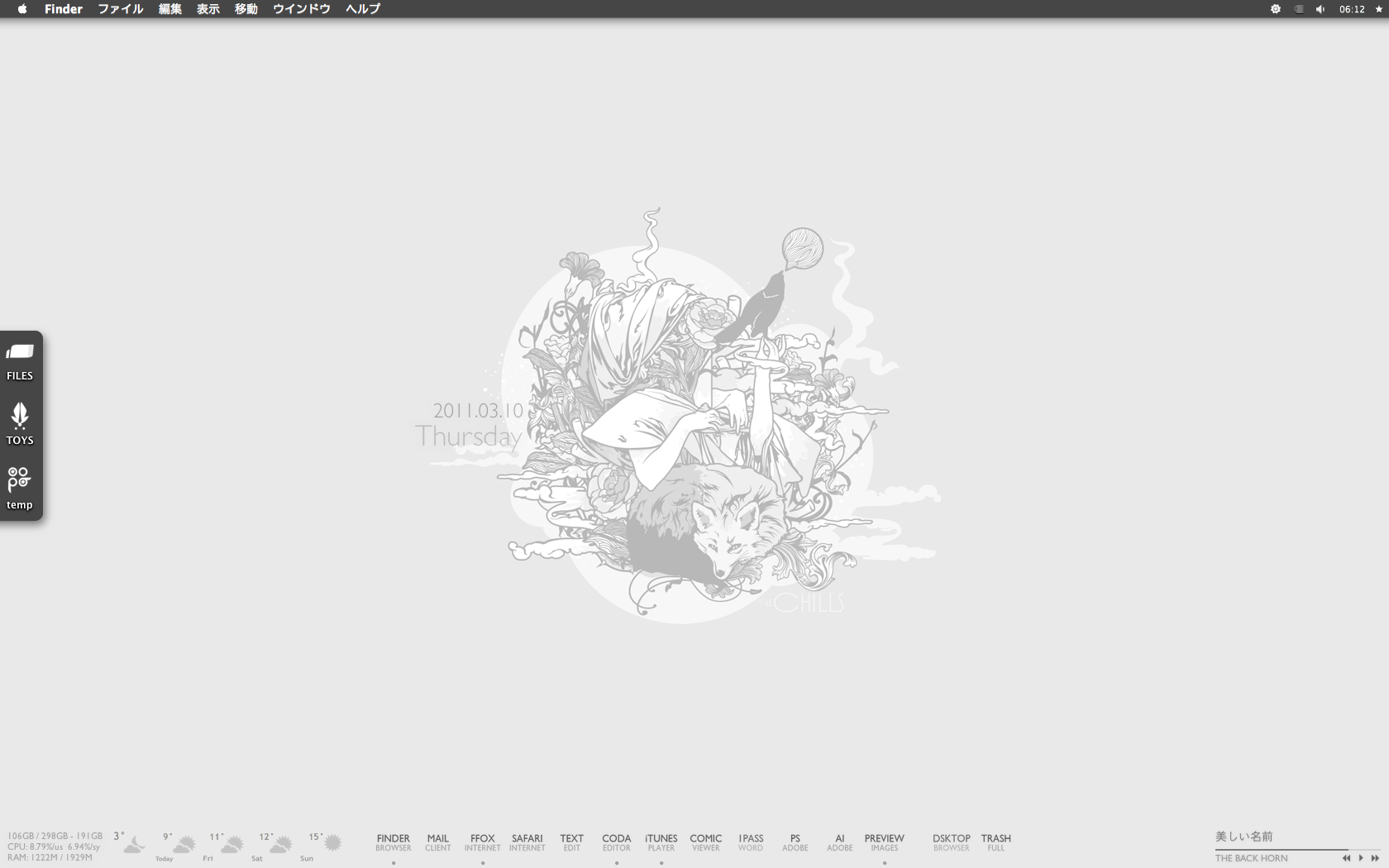 × [PR]上記の広告は3ヶ月以上新規記事投稿のないブログに表示されています。新しい記事を書く事で広告が消えます。 Wallpaper : The Chills .2009. by j3concepts Theme : Caesar for SL by Wowzera / Mods by Me Dock : Gill Sans Text Dock Icons by arcticTransfuse Icons : AMANA ICONS B by imrik Bowtie : Zukunft by arcticTransfuse / Mods by Me Yahoo Widget : widescapeWeather by Robert Wünsch DesktopLyrics by corecode PR